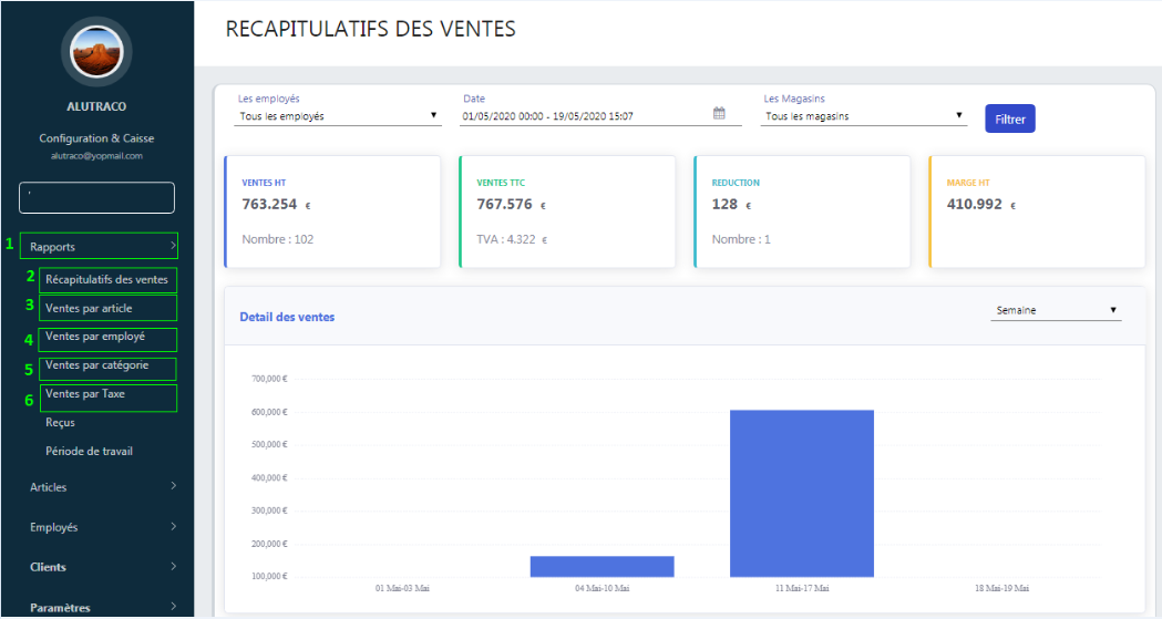 Une fois connecté, le backoffice vous affiche le récapitulatif des ventes de vos magasins. Dans le menu de gauche en cliquant sur « Rapport » vous avez la possibilité d’afficher les détails de vos ventes tels que :